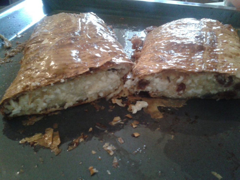 Összetevők:réteslap 3 db, túró 50 dkg,mazsola,cukor1 kis bögre,1 citrom héja,2 ek. búzadara,1 db tojás, 2 ek .citromlé. Teendők: a három db rétes lapot egymásra terítjük,közé kenünk olajat vagy joghurtot. Az összetevőket össze keverjük. A rétes lapra rá tesszük a túró krémet, óvatosan feltekerjük és át tesszük a kivajazott tepsibe. Be tesszük sülni az előmelegített sütőbe... Jó étvágyat!